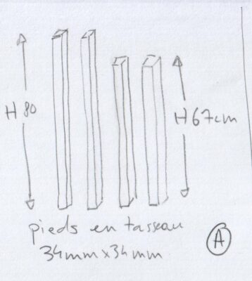 Aussi, mais c’est l’amateur qui parle, vous indiquez dans la liste des morceaux de bois un tasseau 34×34 pour les pieds. Or, et c’est là où je me suis fais avoir, sur le premier dessin des pieds, la longueur totale dépasse 240 (80×2 +67×2=294).