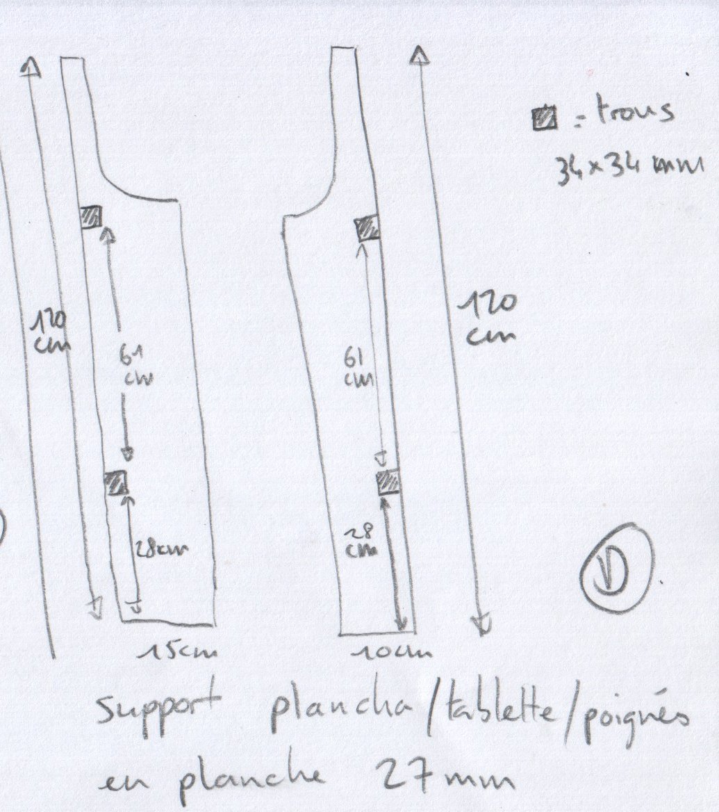 Sur le plan, la tablette est à droite (si l’on présume que la planche D de 15cm de large est devant). Sur les photos, elle est à gauche car j’ai mis ma planche D de 15cm derrière et que les pieds avant de ma plancha sont plus reculés que ceux arrière ; je ne peux donc pas la mettre dans l’autre sens, mais finalement, ça me va bien car je suis gaucher.