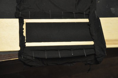 Il reste ensuite à l’ « entoiler » avec du tissu acoustique, que l’on trouve sur eBay (en fait du polyester 83% + élasthane 17%). Ce n’est pas évident car il faut légèrement l’étirer, mais de manière uniforme. J’ai procédé en l’épinglant sur une autre planche de balsa, et en rabattant côté par côté pour coller. J’ai commencé par les côtés courts :