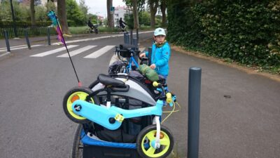 Arrivé au bout de ma rue, il est fatigué, on l’intègre dans la remorque et on décolle pour 6 km, jusqu’aux jeux de la ferme des Cinquante.