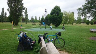 Puis on arrive ! En pleine fermeture de l’accueil, à 13h30. On tue une demi heure à l’aire de jeux du camping, qui n’est pas spécialement génial, mais qui fait bien l’affaire pour une nuit.