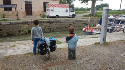 Après la pause jeux on repart (à trois vélos). Cette fois ci Gaspard roule un petit kilomètre. Paul et Gaspard font sensation chez les cyclo-touristes, ils reçoivent des bravo et des félicitations, du coup, ils disent bonjour à tout le monde.