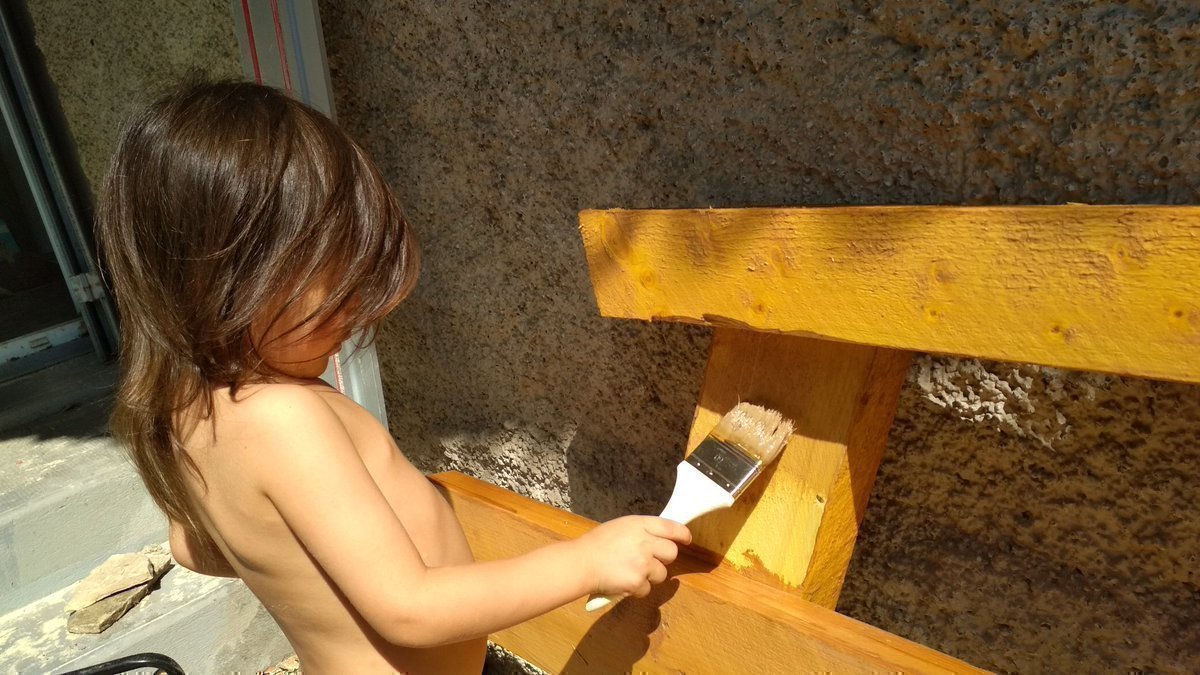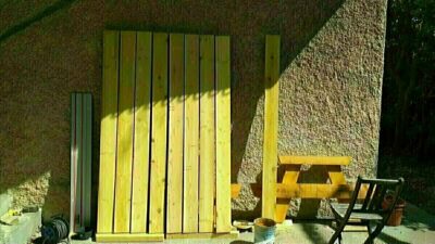 Étape 4 : On lasure les pieds, ainsi qu’une face (qui sera le dessous, choisissez les côtés les plus abîmés) de chaque planche de 2 mètres, et leurs côtés (ce serait assez difficile à faire après assemblage) :