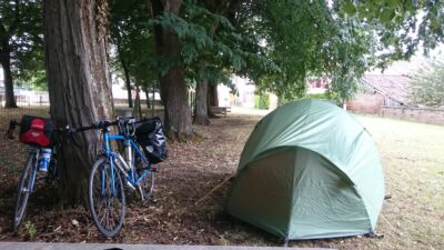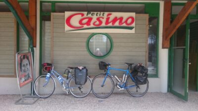 Et nous voici arrivés au camping du Mas d’Agenais après 81km, un tout petit camping de dix emplacements. Sur le panneau à l’entrée, il était écrit d’aller payer à la mairie aux heures d’ouverture et que sinon, un régisseur passait le soir. Effectivement, un bruit de diesel nous a réveillé vers 20:30 alors qu’on commençait à s’endormir et une dame nous a fait payer 5.40€. Pour être entièrement honnête j’ai presque été surprise qu’elle ne nous demande pas des francs, et je jurerais qu’elle roulait dans une vieille Citroën. En revanche ce mini-camping est équipé de douches et de lavabos tout ce qu’il y a de plus modernes, avec une eau chaude coulant à flots. Après avoir observé un peu la vie locale, à travers le grillage séparant le camping du parc adjacent (un vieux promenant son chien, un couple de jeunes se roulant des pelles), nous nous sommes endormis au doux son du festival Garorock de Marmande, la mégapole lot-et-garonnaise connue notamment pour ses tomates qui est située 10km plus loin.