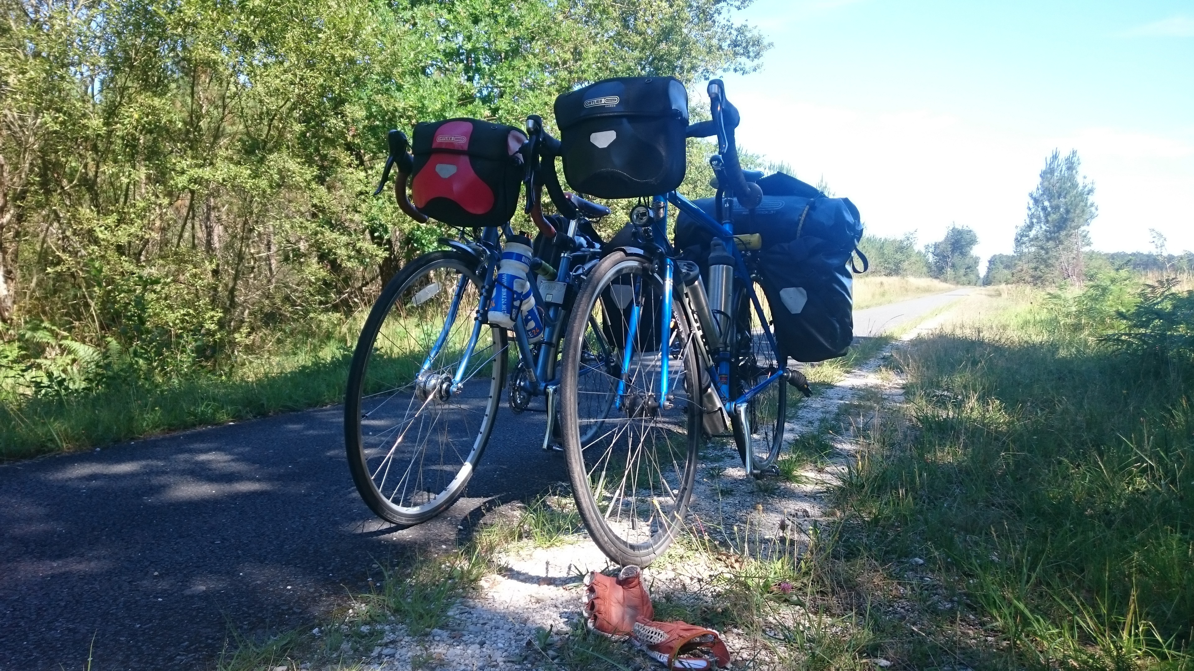 Et on est partis cinq kilomètres plus loin,au camping du Pin Sec, au terme d’une grosse étape de … 27km (genoux obligent) ! Faut rajouter aussi que les Landes ça n’est plat que jusqu’aux 5 derniers km avant la plage, qui eux sont f*cking accidentés !
